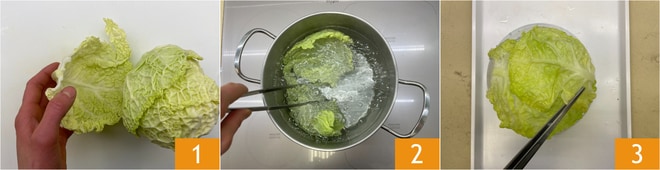 Para preparar os rolinhos de repolho vegetarianos, pegue o repolho e retire as 10 folhas maiores e mais tenras 1. Cozinhe as folhas em abundante água salgada por 3 minutos 2, escorra e deixe esfriar colocando-as sobre uma tigela virada na mesa 3.