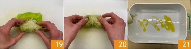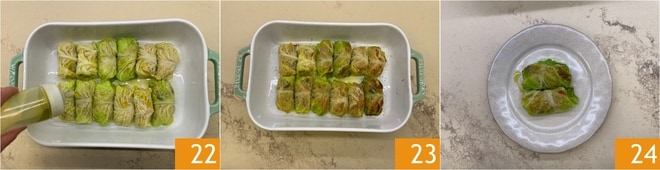 Tempere com sal, pimenta e óleo 22. Asse no forno ventilado pré-aquecido a 180 graus por 20 minutos. Emprate e finalize o prato com um fio de óleo: os rolinhos de repolho vegetarianos estão prontos para serem servidos 24!