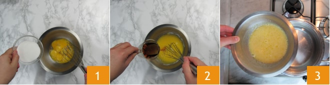 Para preparar o rolo bicolor com zabaione, comece por este último. Em uma tigela, despeje as gemas e o açúcar 1, misture com um batedor antes de incorporar também o marsala 2. Depois, coloque o recipiente em uma panela com água e cozinhe em banho-maria em temperatura baixa, mexendo continuamente 3.