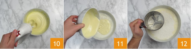 Depois de obter um creme espesso o suficiente 10, despeje-o no recipiente com as claras 11, peneire a farinha 12