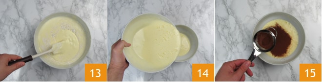 e incorpore tudo delicadamente 13. Em seguida, divida a massa despejando um terço da mistura em outra tigela 14 e peneire nesta última o cacau amargo 15.