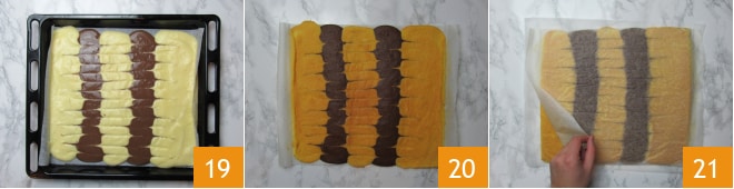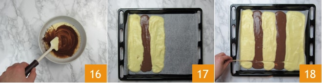 E, mesmo neste caso, misture delicadamente para não desmontar a mistura 16. Agora que você tem tudo, deverá despejar a mistura em uma assadeira forrada com papel manteiga. Alternando entre elas, faça 3 tiras de massa clara e 2 de massa escura 17. Passe um espeto de madeira de um lado para o outro, de modo que a massa pareça costurada uma vez assada 18.