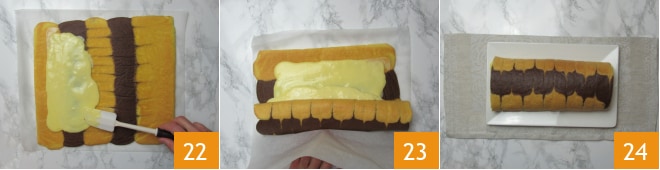 Recupere o zabaione da geladeira e espalhe sobre toda a superfície da massa de biscoito, cuidando para deixar livres alguns centímetros de cada lado 22. Enrole delicadamente ajudando-se com a folha de papel manteiga 23 e aqui está seu rolo bicolor com zabaione pronto 24.