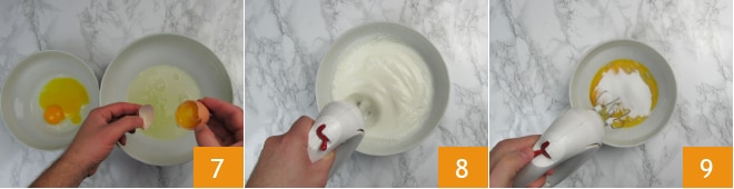 Enquanto isso, passe para a massa de biscoito. Separe as gemas das claras 7 e bata as claras em neve firme com um batedor elétrico; uma vez prontas, coloque-as na geladeira 8. Passe para as gemas, adicione o açúcar e bata também 9.