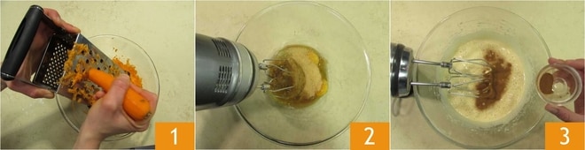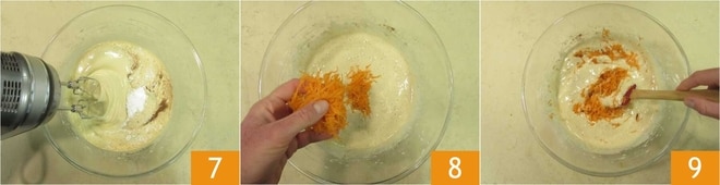 Bata a mistura com a batedeira elétrica em baixa velocidade por cerca de 1 minuto 7. Quando obtiver uma consistência homogênea, adicione as cenouras raladas 8 e misture delicadamente com uma espátula, fazendo movimentos rotativos de baixo para cima 9.