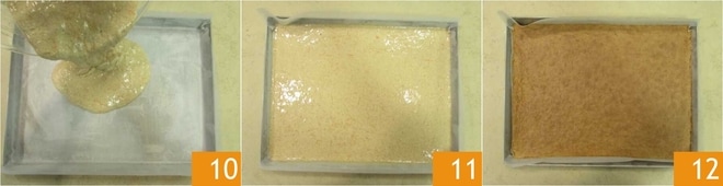 Transfira a mistura para uma assadeira de 30x40 cm forrada com papel manteiga 10, espalhe a mistura para preencher toda a superfície 11 e asse em forno estático pré-aquecido a 200°C por 15 minutos. Quando estiver assado, retire do forno 12