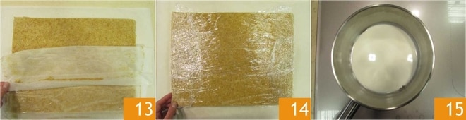 e vire o biscoito macio sobre uma folha de papel manteiga 13. Remova delicadamente o papel manteiga utilizado na cocção e cubra o biscoito com filme plástico 14. Reserve e deixe esfriar completamente por cerca de 1 hora. Enquanto isso, prepare o recheio. Em uma panela, coloque 20 g de chantilly e leve à fervura 15.