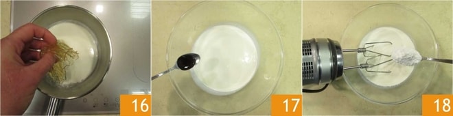 Desligue o fogo e adicione a gelatina escorrida 16, mexa até que esteja completamente dissolvida. Reserve por um momento. Coloque os outros 400 g de chantilly em uma tigela, adicione o extrato de baunilha 17 e comece a bater com a batedeira elétrica, incorporando o açúcar de confeiteiro aos poucos 18.