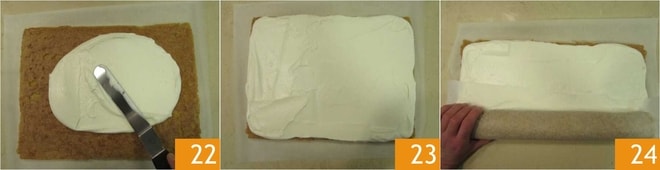 Retome o biscoito macio e vire-o novamente. Coloque o recheio por cima 22 e espalhe por toda a superfície 23. Transfira para uma bandeja e coloque na geladeira por 15 minutos. Em seguida, retire e, com a ajuda do papel manteiga, enrole pela parte mais longa, fazendo uma pressão delicada com as mãos 24.