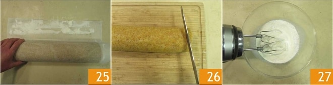 Para preparar o rolo de cenoura, como primeira coisa, descasque e rale finamente as cenouras 1. Você deve obter 140 g. Em outra tigela, coloque os ovos e o açúcar mascavo. Bata com a batedeira elétrica 2 por cerca de 5 minutos. Quando o composto estiver fofo e espumoso, adicione a canela 3,