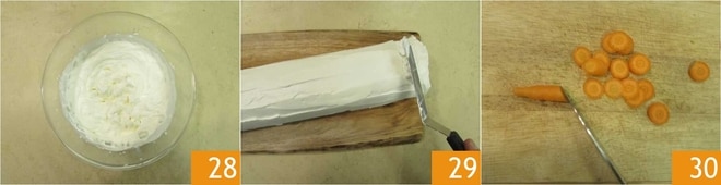 e bata. Deve ficar liso e brilhante 28. Com a ajuda de uma espátula, cubra toda a superfície do rolo 29 e coloque na geladeira por mais 30 minutos. Enquanto isso, prepare as decorações. Lave, seque e corte a pequena cenoura em rodelas 30 e reserve.