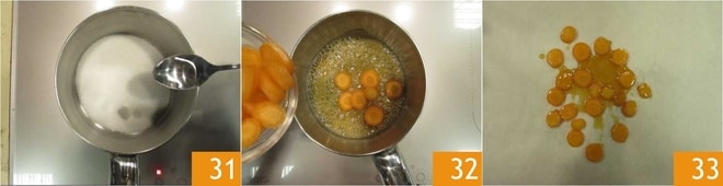 Prepare o caramelo: coloque o açúcar e a água em uma panela 31. Espere alguns minutos e quando o açúcar estiver bem caramelizado, adicione as cenouras 32. Gire a panela para cobrir completamente as cenouras 32. Transfira para papel manteiga 33 e deixe esfriar em temperatura ambiente.