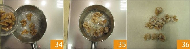 Agora prepare as nozes cristalizadas. Em uma panela, coloque o açúcar e a água. Quando o açúcar estiver completamente dissolvido, adicione as nozes 34 e mexa. O açúcar ainda não caramelizado se fixará nos núcleos das nozes, dando o típico efeito cristalizado 35. Transfira para papel manteiga e deixe esfriar em temperatura ambiente 36.