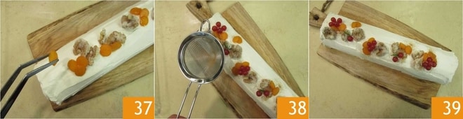Então, recupere o rolo, decore com nozes e cenouras 37, adicione as groselhas, uma pitada de canela 38 e sirva 39.