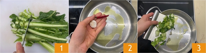 Para preparar o rolo de coelho com pinhões e uvas-passas, primeiro lave, limpe e corte a cicória em pedaços 1. Em uma panela aqueça um fio de azeite com o alho e a pimenta 2, depois acrescente a cicória 3.