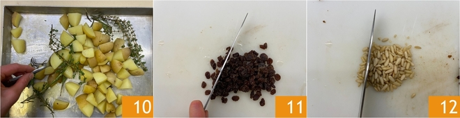 Escorra as batatas e disponha-as na assadeira 10, salgue e misture. Asse em forno estático preaquecido a 2000 por 40 minutos. Enquanto isso, pique as uvas-passas 11 (já hidratadas em água e bem escorridas) e os pinhões 12.