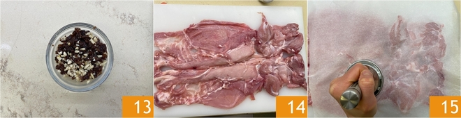 Misture uvas-passas e pinhões em uma tigela e reserve 13. Estenda o coelho sobre a tábua 14, coloque por cima uma folha de papel manteiga e bata a carne até obter uma espessura mais fina 15.