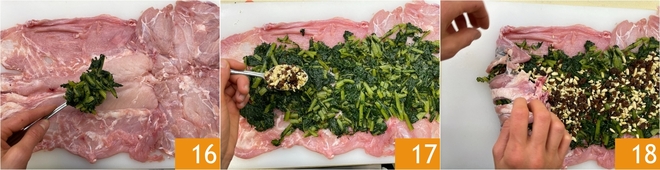 Distribua sobre a superfície a cicória 16, as uvas-passas e os pinhões 17. Dobre para dentro um dos lados curtos 18.