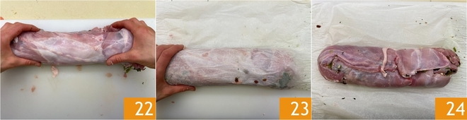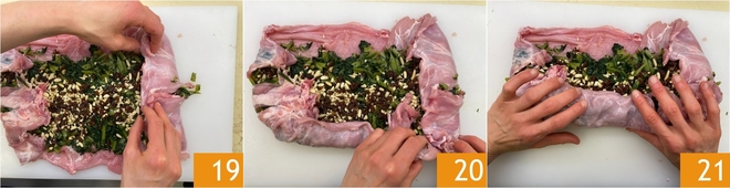 Faça o mesmo com o lado oposto 19, depois enrole a carne pelo lado mais longo 20, tomando cuidado para selar bem o recheio no interior 21.