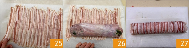 Neste momento, disponha as fatias de pancetta sobre uma tábua, sobrepondo-as levemente 25. Coloque o rolo de coelho na borda inferior alongada 26 e levante delicadamente as fatias de pancetta para envolvê-lo completamente 27.