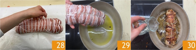 Como amarrar o assado com barbante de cozinha 28 como se fosse um assado. Doure o rolo em uma panela untada com azeite por todos os lados em fogo médio 30. Acrescente vinho branco 31 e deixe evaporar.