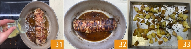 Adicione o caldo quente 31 e termine o cozimento do coelho em forno estático a 1800 por 30 minutos 32. Enquanto isso as batatas estarão prontas, então retire-as do forno 34 e mantenha-as aquecidas.
