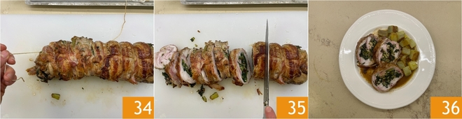 Depois de tirar o rolo do forno, deixe-o descansar sobre a tábua por cerca de dez minutos antes de remover o barbante 34 e cortá-lo em fatias 35. O seu rolo de coelho com uvas-passas e pinhões está pronto para ser servido junto com as batatas assadas 36!