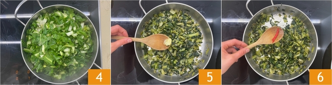 Cozinhe por cerca de 10 minutos em fogo médio-alto 4, até que esteja bem cozida, então retire o alho 5 e a pimenta 6, tempere com sal e deixe amornar.