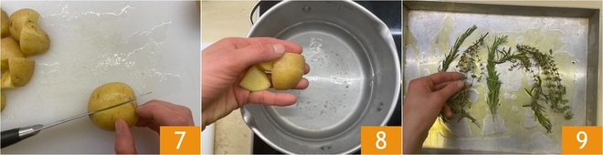 Agora corte as batatas em cubos 7 e escalde-as por 7-8 minutos 8. Enquanto isso, unte uma assadeira com azeite e tempere com alecrim e tomilho 9.