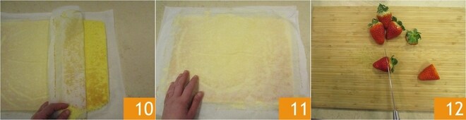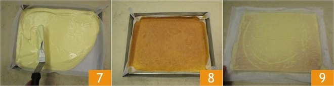 Nivele a superfície com uma espátula 7 e asse em forno estático pré-aquecido a 220°C por 8-10 minutos até que a superfície esteja dourada e a massa esteja cozida 8. Obviamente, ajuste de acordo com o seu forno, pode levar menos minutos ou uma temperatura mais baixa se for muito potente. Enquanto isso, prepare uma folha de papel manteiga e coloque-a sobre o balcão. Assim que retirar a massa de biscoito do forno, vire-a sobre o papel manteiga 9, dessa forma ela permanecerá úmida.