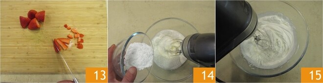 Corte-os primeiro em fatias e depois em cubos 13. Despeje o creme de leite fresco frio em uma tigela; comece a bater com as batedeiras elétricas e adicione lentamente o açúcar de confeiteiro 14. Continue até obter um creme firme, mas não muito batido 15.