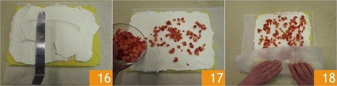 Uma vez que a massa de biscoito esteja completamente fria, remova o papel manteiga e recheie-a com o creme de leite batido. Com a ajuda de uma espátula, espalhe bem por toda a superfície 16. Espalhe os morangos por cima 17 e, levantando o papel manteiga, enrole o rolo pelo lado mais curto 18.