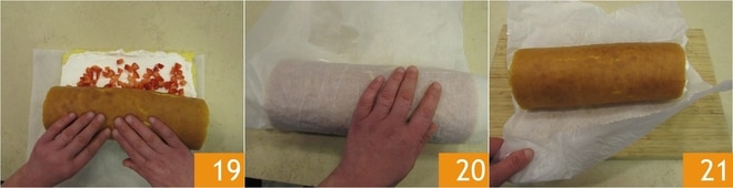 Aperte-o delicadamente 19 e certifique-se de que a junção do rolo fique voltada para baixo 20. Enrole-o novamente no papel manteiga 20 e leve à geladeira por 30 minutos. Em seguida, retire o rolo e desembrulhe-o 21.