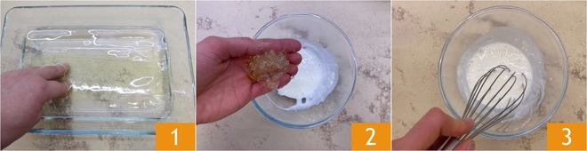 Para preparar o rolo de pandoro com creme de ricota, comece pelo creme: coloque a gelatina de molho em água fria 1 e aqueça em uma panela 30 g de creme de leite retirados da quantidade total. Esprema a gelatina e incorpore-a ao creme quente 2, depois mexa com o batedor para dissolver uniformemente 3 e reserve.