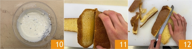 Coloque o creme na geladeira por cerca de dez minutos 10. Enquanto isso, corte 4 fatias de pandoro, com cerca de 1-1,5 cm de espessura, retirando da parte central para obter fatias mais regulares 11. Com uma faca, elimine a crosta externa, mas não jogue fora pois será útil mais adiante na receita 12.