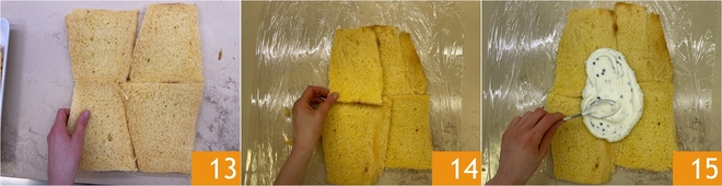 Disponha as fatias na bancada e junte-as para formar um retângulo o mais regular possível 13. Estenda uma folha de filme plástico sobre a superfície de trabalho e coloque sobre ela as fatias de pandoro ligeiramente sobrepostas 14. Neste ponto, amasse-as com o rolo para que se fixem bem entre si e fiquem mais finas. Quando o creme estiver ligeiramente firme, despeje-o no centro do retângulo de pandoro 15.