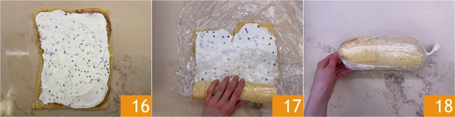 Distribua-o com as costas da colher por toda a superfície 16. Se ainda estiver muito mole, você pode colocar tudo na geladeira por alguns minutos. Com a ajuda do filme plástico, comece a enrolar o retângulo pelo lado mais curto, apertando bem para formar um rolo compacto 17. Sele as extremidades como um doce e deixe o rolo firmar na geladeira por cerca de uma hora 18.