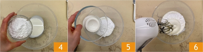 Enquanto isso, despeje em uma tigela os restantes 70 g de creme de leite, o açúcar de confeiteiro 4 e a ricota 6, depois comece a misturar com as batedeiras elétricas ou à mão 6.