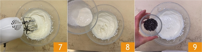 Continue batendo até obter um creme fofo e uniforme 7. Neste ponto, incorpore a mistura de creme de leite e gelatina 8 e misture delicadamente, depois adicione as gotas de chocolate 9.