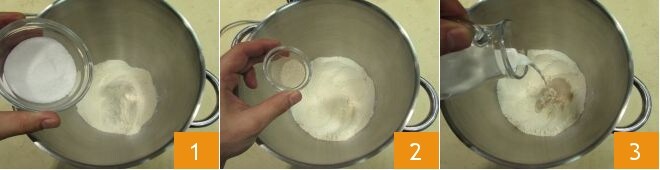 Para preparar o rolo de sementes de papoula, amêndoas e marzipã, comece pela massa: na tigela de uma batedeira equipada com a pá, coloque a farinha peneirada, o açúcar refinado 1, o fermento seco 2. Adicione o leite aos poucos 3,