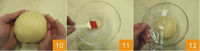 Continue até que a massa fique ligada ao gancho, então coloque-a em uma superfície de trabalho e forme uma bola 10, unte uma tigela 11, coloque a bola de massa, cubra com filme plástico 12 e deixe crescer no forno desligado com a luz acesa por cerca de 4 horas ou até que a massa triplique de volume.
