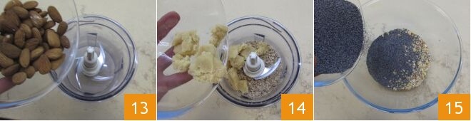 Enquanto isso, na tigela de um processador, coloque as amêndoas 13, o marzipã em pedaços pequenos 14, triture tudo junto e depois transfira a mistura para uma tigela, adicione as sementes de papoula 15,