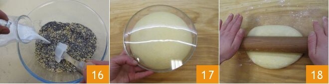 por último, adicione o leite aos poucos, misturando com uma espátula 16 para incorporar todos os ingredientes. Retome a massa que triplicou de volume 17, estenda-a com um rolo em uma superfície enfarinhada 18