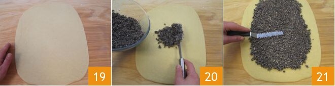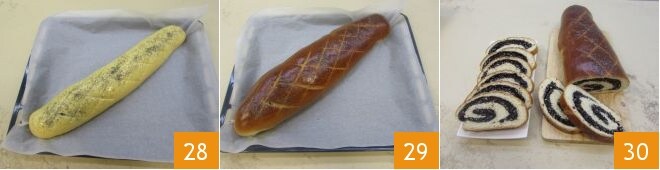 faça incisões na superfície com uma faca de lâmina lisa em diagonais cruzadas para criar um padrão de losangos 28, polvilhe com sementes de papoula 29 e asse em forno estático pré-aquecido a 170° por 30 minutos (ou em forno ventilado a 150° por 20 minutos). Depois de assado, retire do forno o rolo de sementes de papoula, amêndoas e marzipã, deixe esfriar e depois sirva em fatias 30.