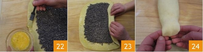 Pincele a borda com o ovo batido 22. Enrole a massa pelo lado maior 23 e sele a pasta nas junções e dobre as duas extremidades para baixo para fechar 24.