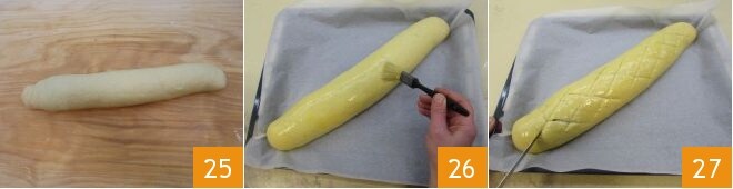 Você terá obtido seu rolo 25, coloque-o em uma assadeira forrada com papel manteiga 26, pincele a superfície com o ovo batido 27,