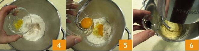 aromatize com as raspas de limão 4. Por fim, adicione os ovos e ligue a batedeira 5, quando todos os ingredientes estiverem misturados, substitua a pá pelo gancho, adicione também as sementes da fava de baunilha 6,