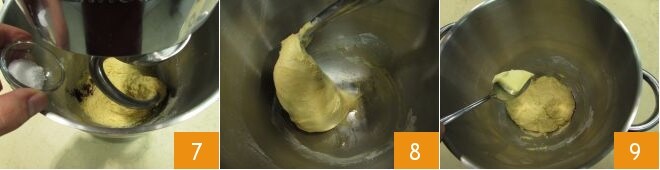 o sal 7, sove com o gancho 8 e sem parar a máquina, adicione a manteiga em pedaços pequenos 9, esperando que cada pedaço seja incorporado antes de adicionar outro.