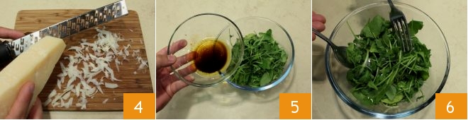 Rale o Parmigiano em lascas e reserve 4. Depois de lavar e secar a rúcula, tempere-a em uma tigela grande despejando a emulsão por cima 5 e misturando bem para temperar todas as folhas 6.