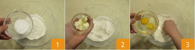 Para preparar as rosas de Carnaval, comece pela massa: em uma tigela, coloque a farinha, o açúcar 1 e a manteiga amolecida 2 e esfarele tudo com as mãos. Adicione os dois ovos 3 e amasse misturando tudo.